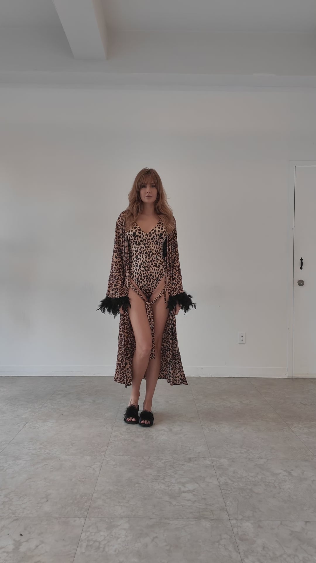 Unleash your wild side with our Leopard Print Satin Robe & Bodysuit Set, a bold and luxurious ensemble that combines comfort with seduction. The long satin kimono robe features dramatic feather-trimmed sleeves and a tie waist, creating a glamorous silhouette. Paired with a sleek matching leopard-print bodysuit, this set is designed to make a statement whether worn for intimate evenings, boudoir photoshoots, or lounging in elevated style.